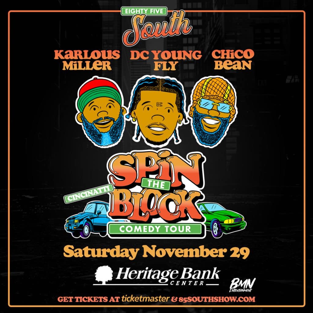 Cincinnati, OH Saturday November 29, 2025 Cincinnati, OH Heritage Bank Center Karlous MillerDC Young FlyChico Bean BUY TICKETS Want to meet your favorite performers? Drop your email and phone number here for a shot at VIP meet-and-greet passes. "*" indicates required fields Your CityAtlanta, GAAtlantic City, NJBaltimore, MDBiloxi, MSBirmingham, ALCharlotte, NCChicago, ILCincinnati, OHCleveland, OHColumbia, SCDallas, TXDetroit, MIFairfax, VAGrand Rapids, MIGreensboro, NCHampton, VAHouston, TXIndianapolis, INInglewood, CALas Vegas, NVMemphis, TNMiami, FLMilwaukee, WIMinneapolis, MNNashville, TNNew York, NYNew Orleans, LAOakland, CAPhiladelphia, PAPhoenix, AZSouthaven, MSSt. Louis, MOTampa, FLEmail Address* Cell Phone Number*Consent I consent to receive promotional text msgs from "BMN Entertainment", msg freq. varies, Reply HELP for info, STOP to opt-out, Msg & data rates may apply. For Privacy policy, click here: https://bmnshows.com/privacy-policy/