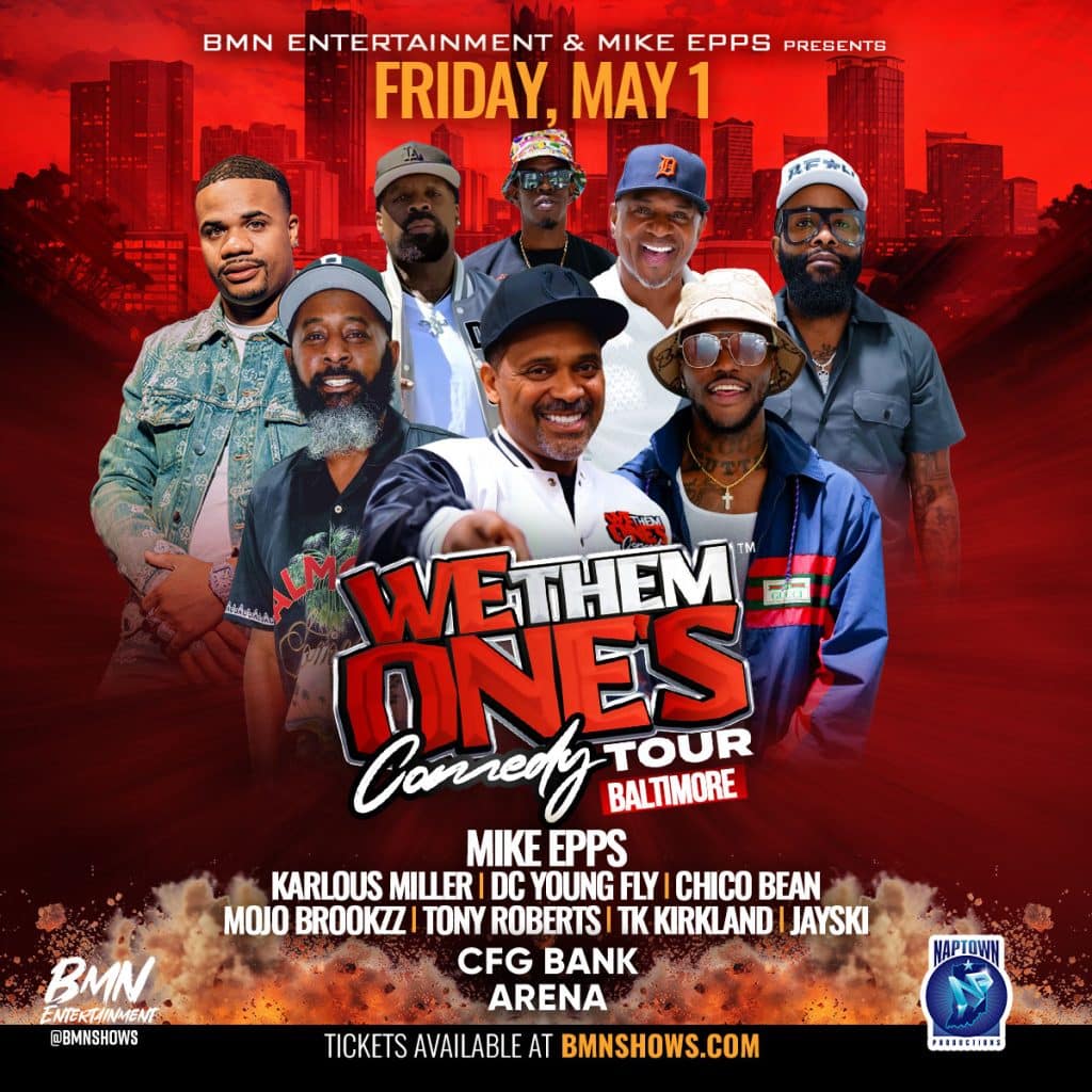 Baltimore, MD Friday May 1, 2026 Baltimore, MD CFG Bank Arena Mike EppsKarlous MillerDC Young FlyChico BeanMojo BrookzzTony RobertsTK KirklandJaySki BUY TICKETS