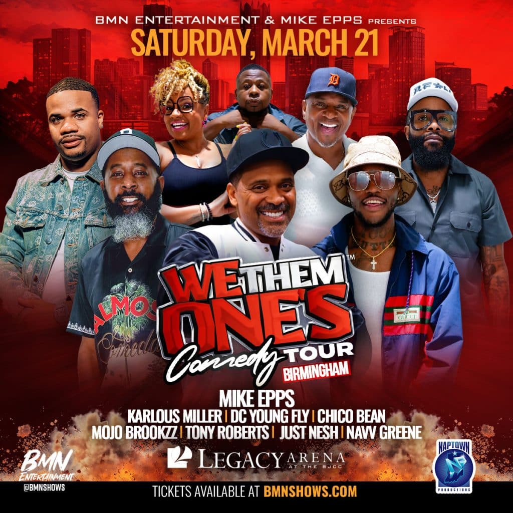 Birmingham, AL Saturday March 21, 2026 Birmingham, AL Legacy Arena Mike EppsKarlous MillerDC Young FlyChico BeanMojo BrookzzTony RobertsJust NeshNavv Greene BUY TICKETS