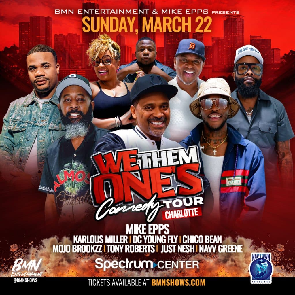 Charlotte, NC Sunday March 22, 2026 Charlotte, NC Spectrum Center Mike EppsKarlous MillerDC Young FlyChico BeanMojo BrookzzTony RobertsJust NeshNavv Greene BUY TICKETS