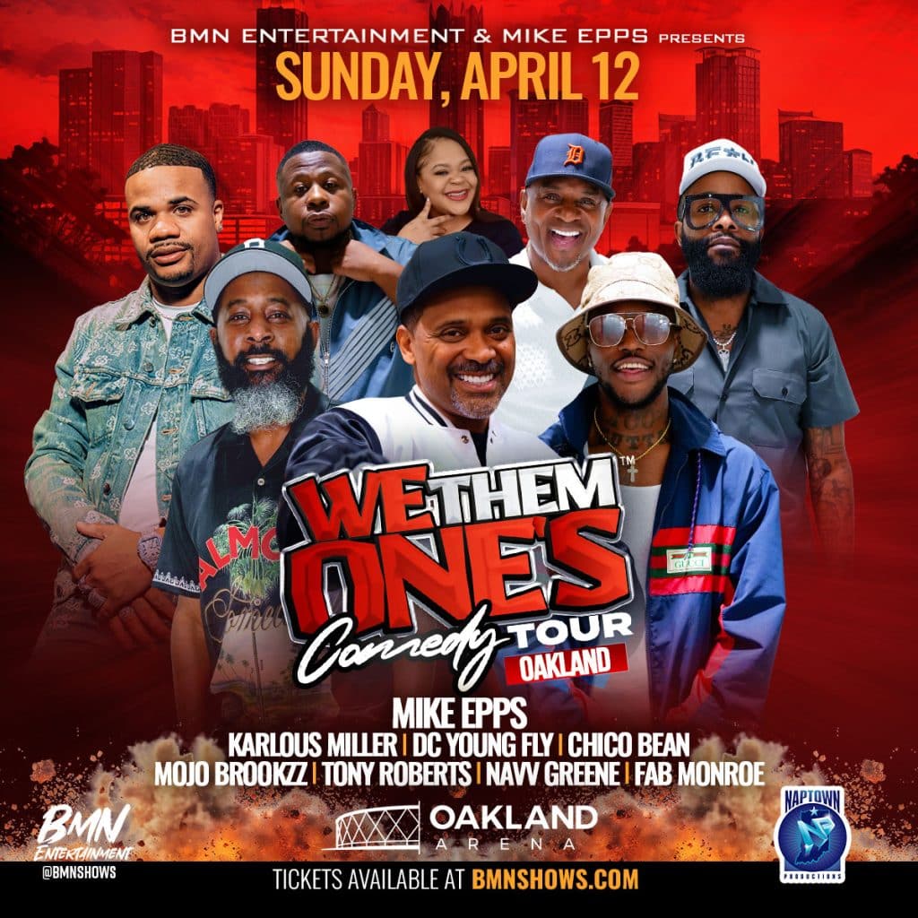 Oakland, CA Sunday April 12, 2026 Oakland, CA Oakland Arena Mike EppsKarlous MillerDC Young FlyChico BeanMojo BrookzzTony RobertsNavv GreeneFab Monroe BUY TICKETS
